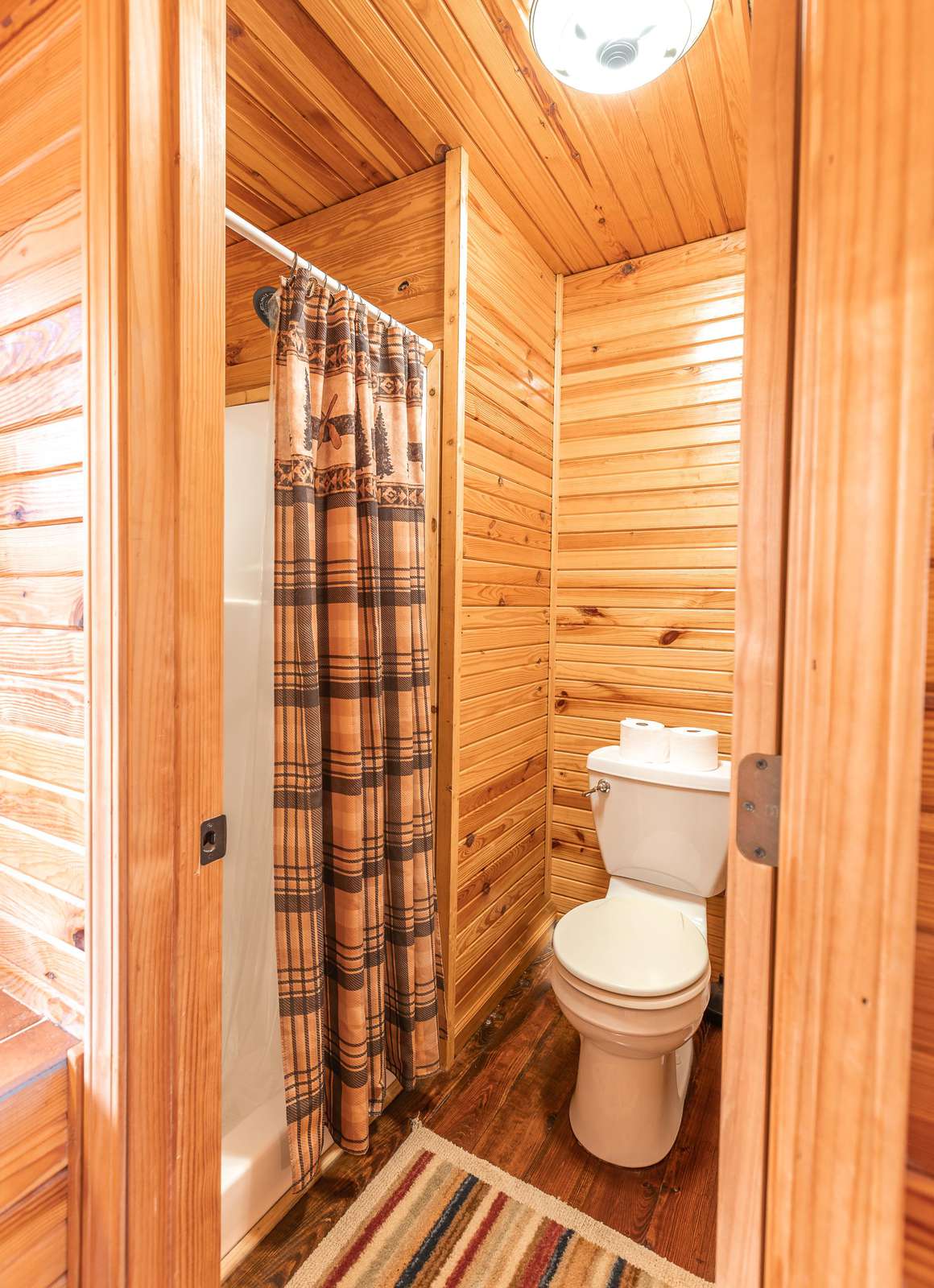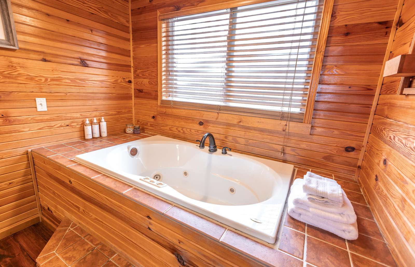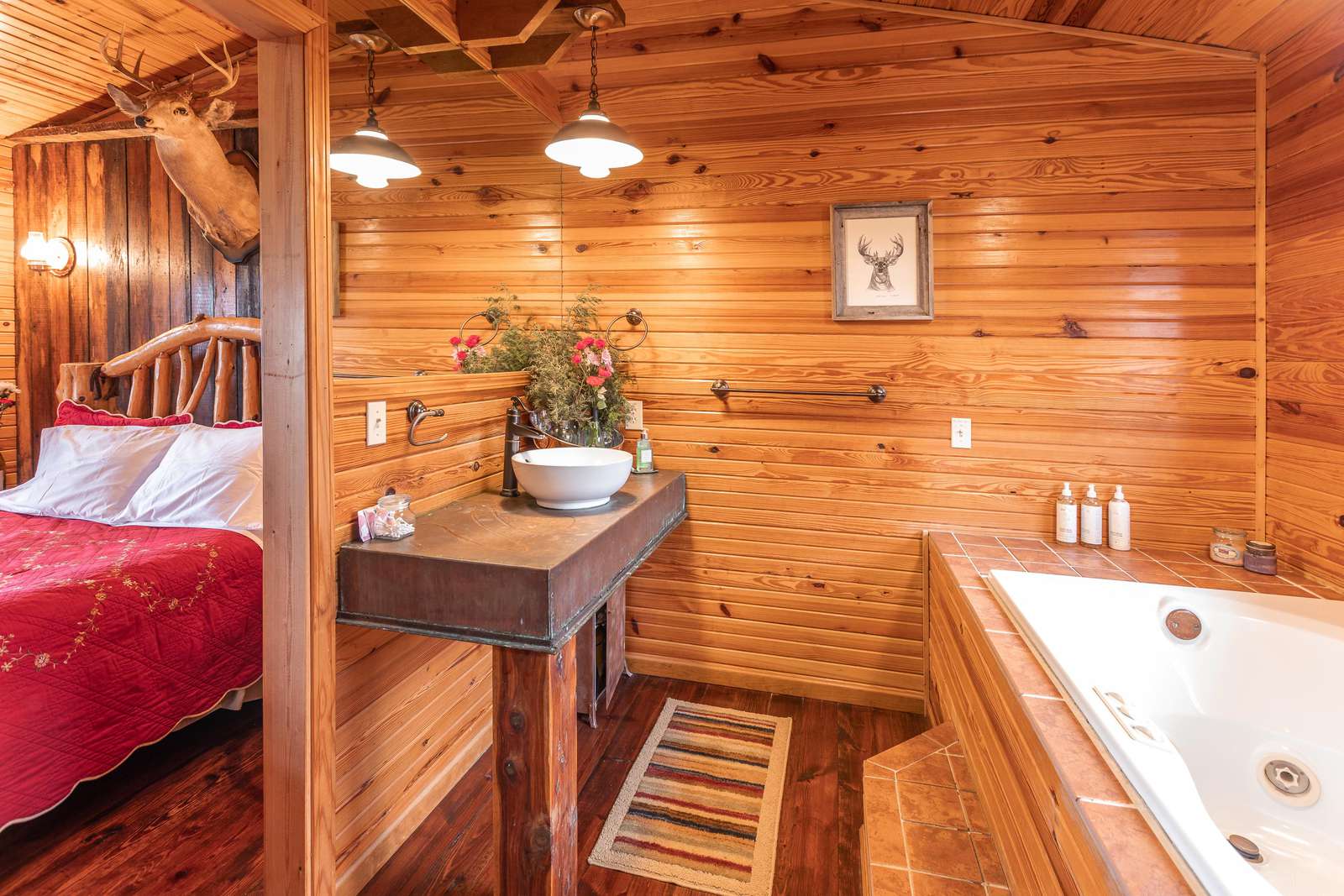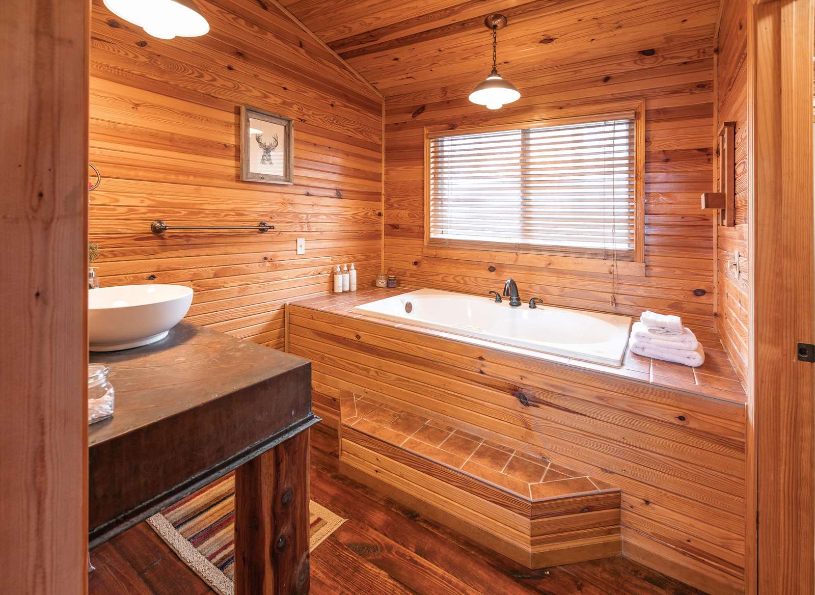 In the cozy sleeping nook, there’s an ultra-comfy hand-carved queen-size log bed and two nightstands. Next to the sleeping space is the spacious bathroom, which includes a step-up jetted tub that is sure to soak all of your cares away. The bathroom also includes a step-in shower and a large vanity with a bowl sink.