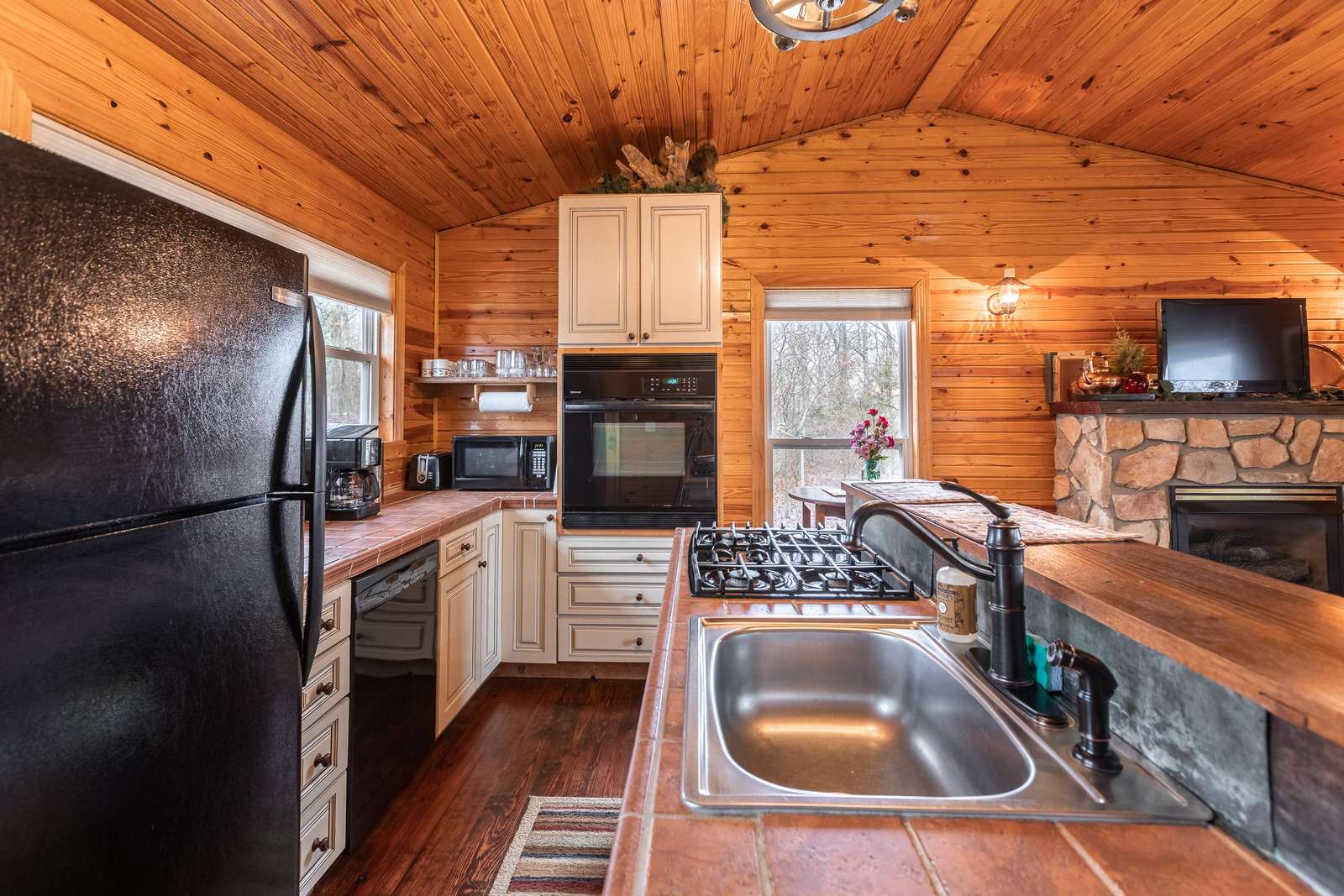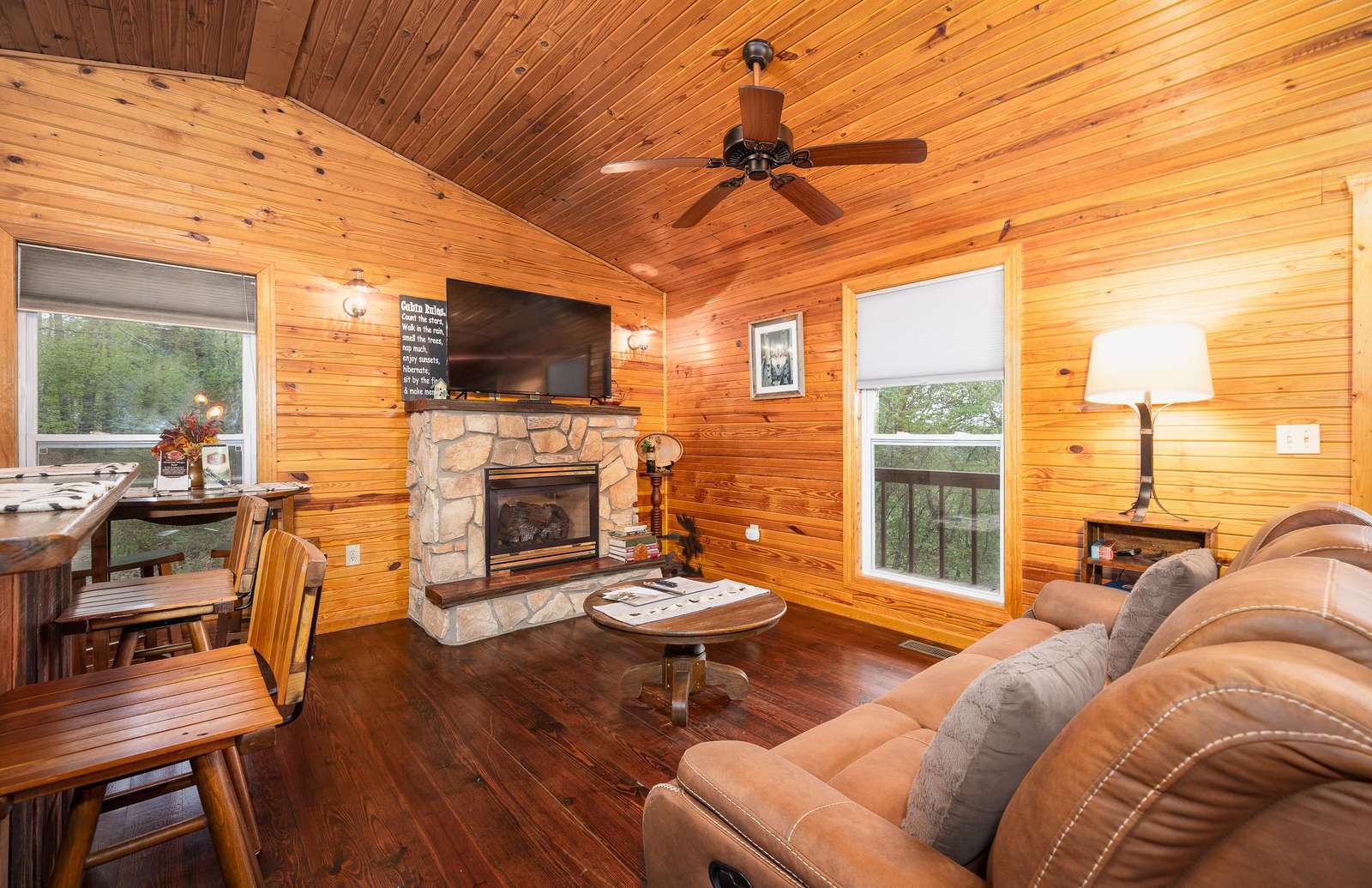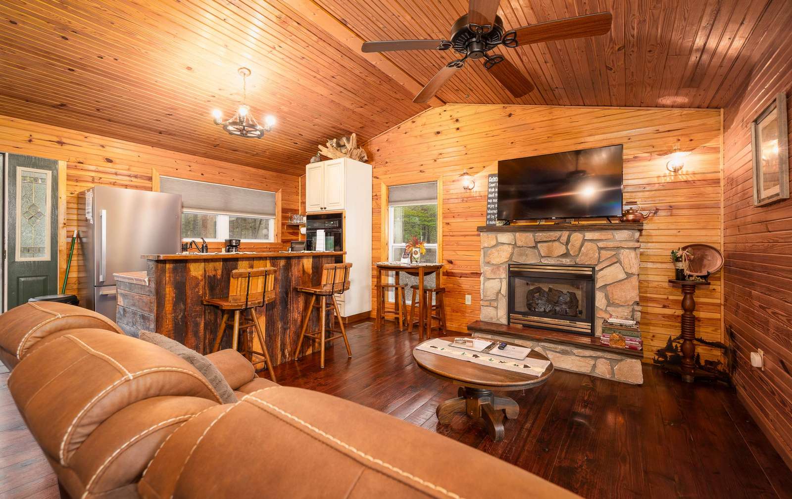 Inside the front door lies the main living area, which has been expertly designed to accommodate everything you need. Honey-colored wood paneling surrounds the room, and large windows let in plenty of the dappled sunlight. In the living space, there’s a plush sofa piled high with comfy throw pillows and facing the stone fireplace. Over the mantel is an HDTV that’s ideal for game day or movie night.