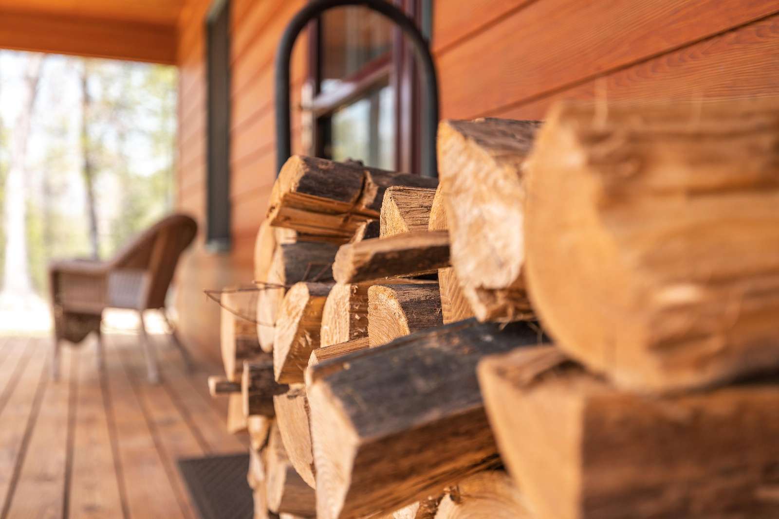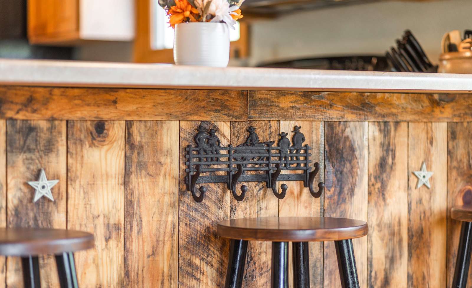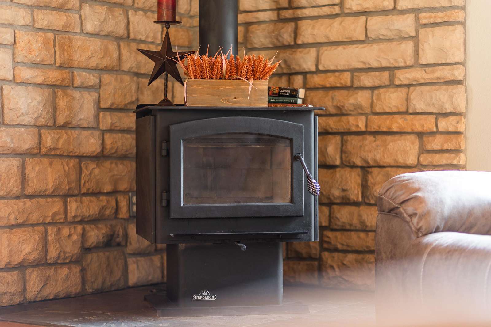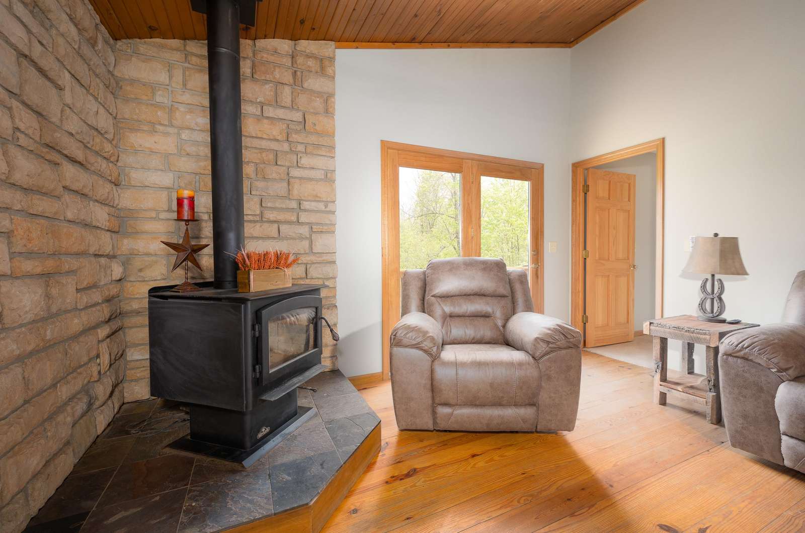 A winding lane leads through the trees, where the lovely log cabin facade and classic front porch of Whispering Winds sit. Open the front door and step into the warm and welcoming great room, with vaulted ceilings and lots of natural sunlight. In the living space, an oversized leather sofa and an ultra-comfy armchair face the large HDTV. In the corner, the wood-burning stove adds just the right dash of coziness to this spacious room. After a day filled with outdoor adventures, your crew will love to curl up here in the evening for a movie night. Through the glass door, there’s also a sunny back porch.