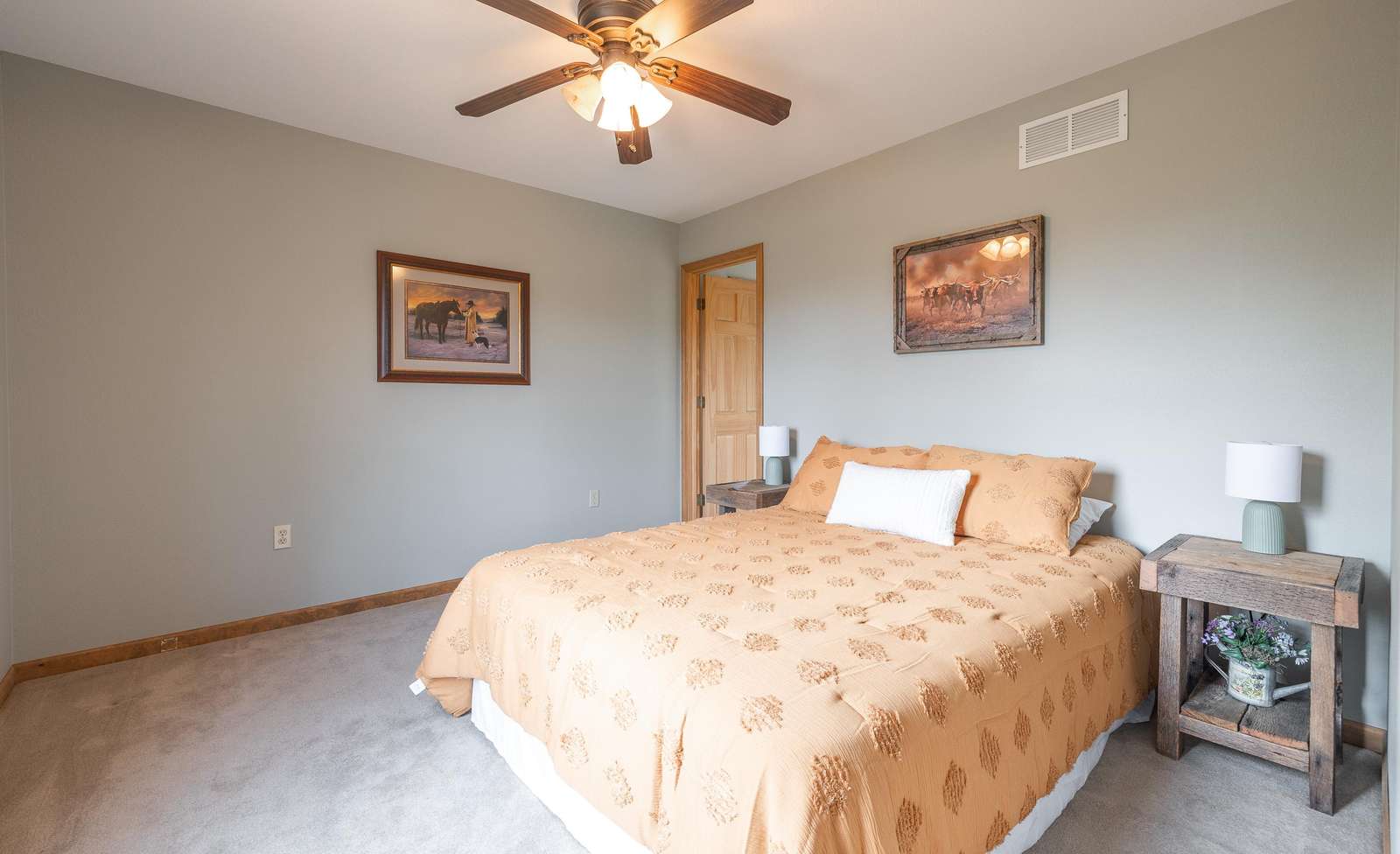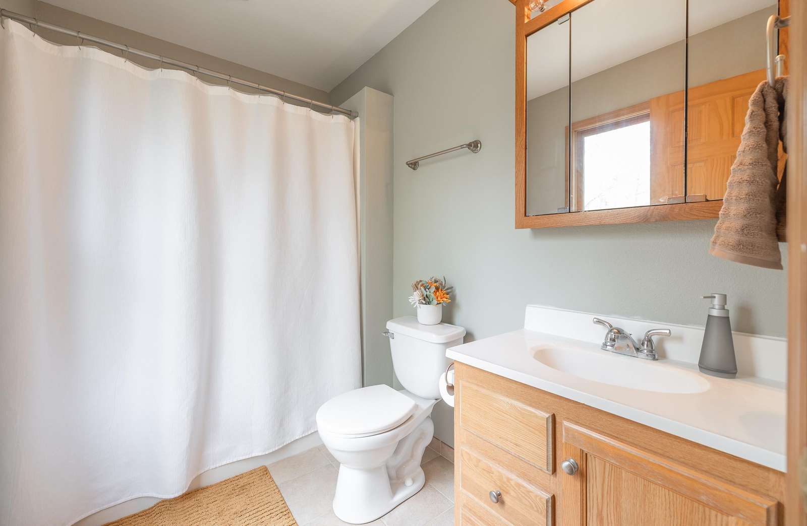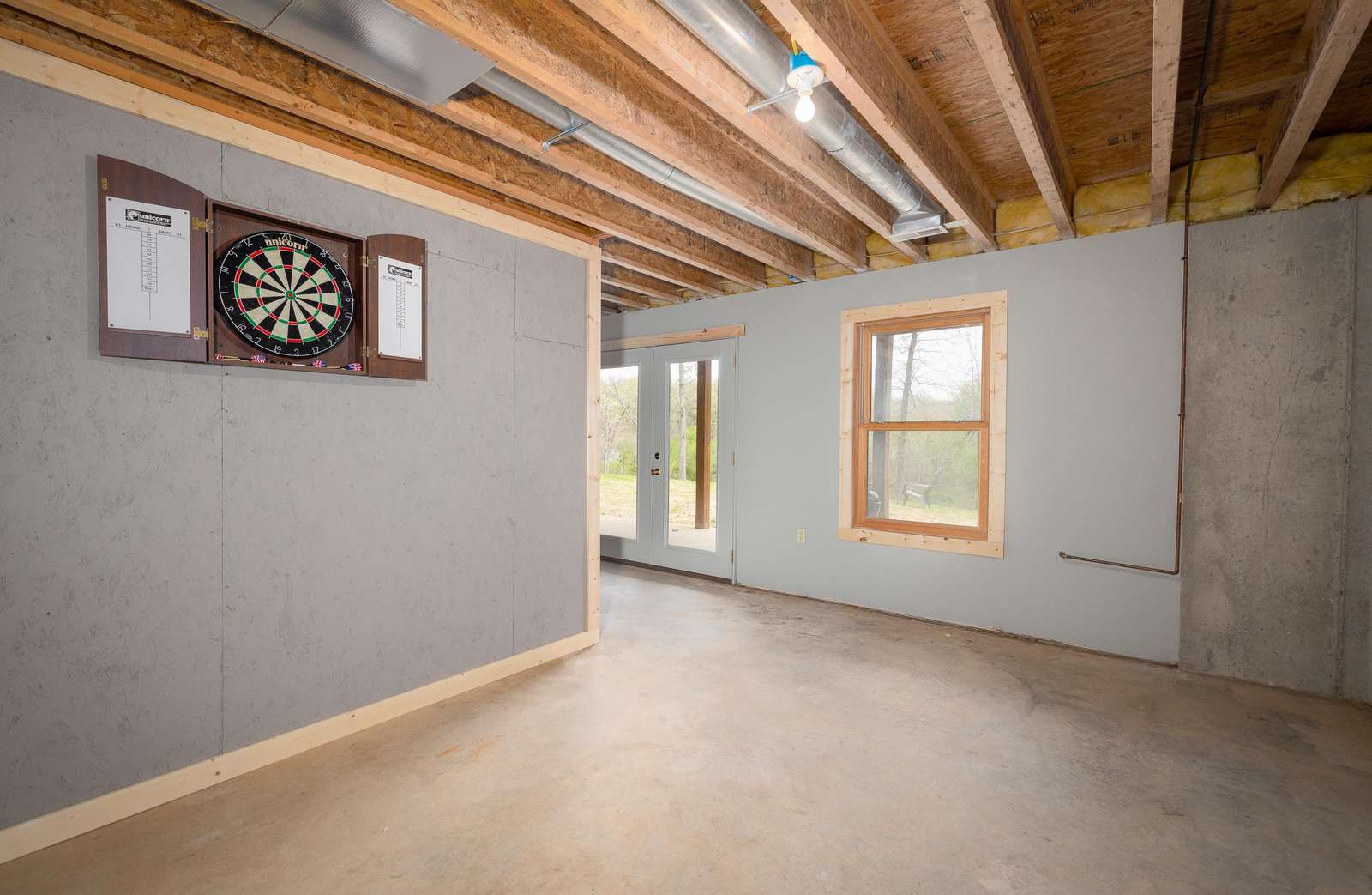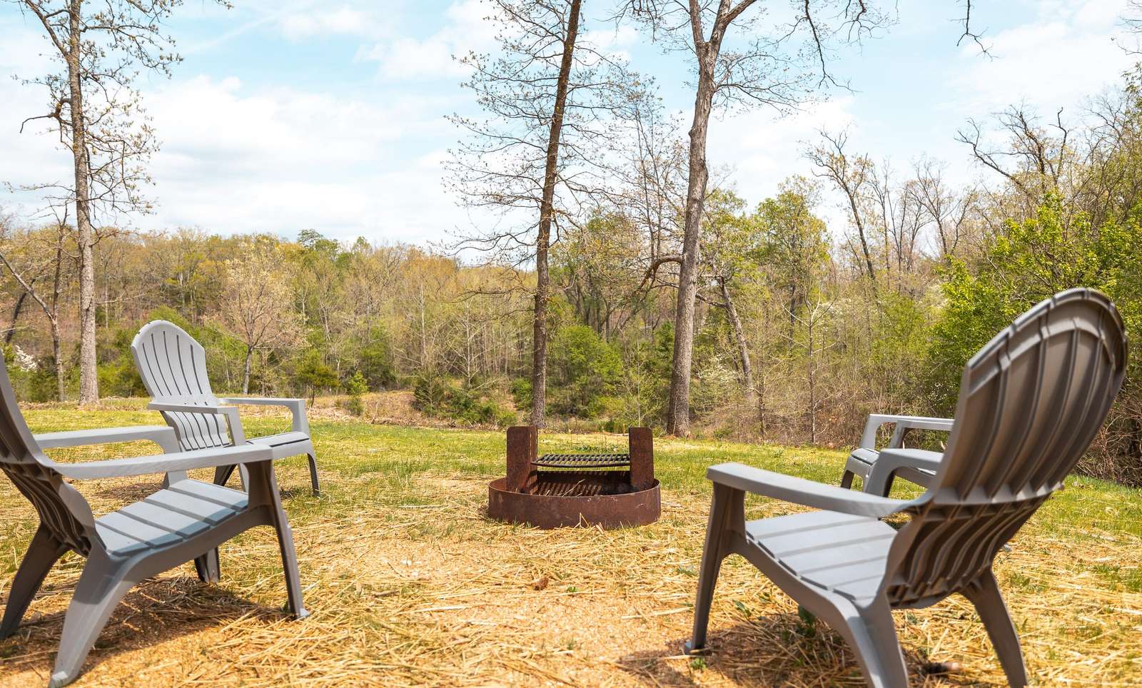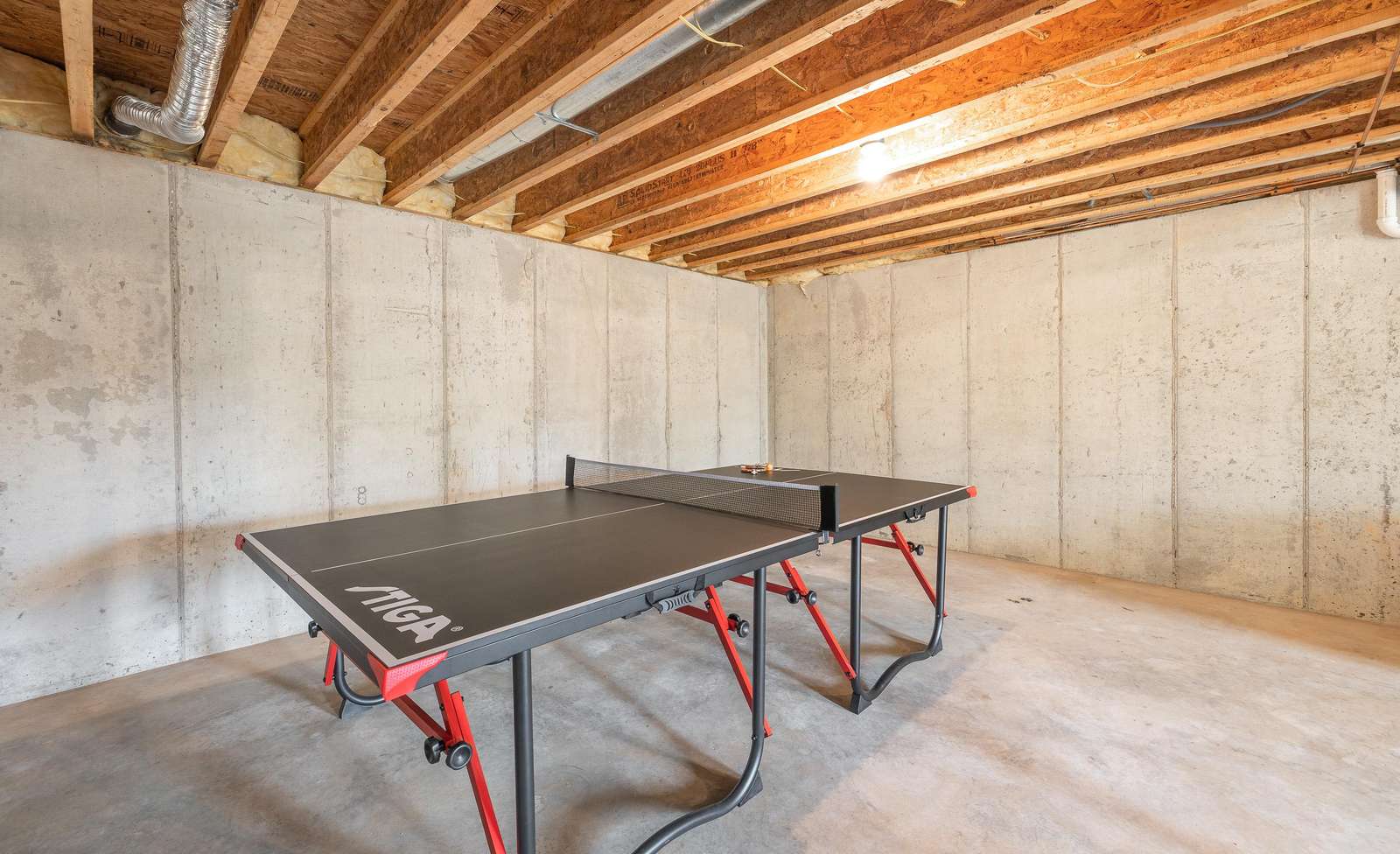 Downstairs is the walk-out basement that has been transformed into a fun game room, complete with a ping pong table, a dart board, and a plush sleeper sofa. Glass doors lead outside to the covered patio and the charcoal grill. There’s even a fantastic firepit surrounded by Adirondack chairs— ideal for roasting marshmallows while watching the sky above that sparkles with thousands of stars.